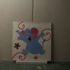 Malerei eines hellblauen Elefanten mit rosanen Ohren auf weißem Hintergrund, von bunten Blumen umgeben, auf feiner reliefartiger Strukturierung.