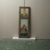 GemäldeGemälde in Fensterrahmen, Abbildung eines bunt gekleideten Pärchens das auf einer Bank sitzt welche auf grünem Rasen steht, darunter schwarze Wolken, auf hellblauem Hintergrund, im oberen Fenster der hinduistische Elefantengott Ganesha auf einer schwarzen Wolke sitzend, auf braunem Fensterrahmen, rustikale Optik durch witterungsbedingte Gebrauchsspuren.