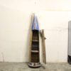 RegaleSchrankregal, mehrfarbig, gefertigt aus einem recyceltem original balinesischen Boot, kantig mit gezacktem Bug, rustikale Optik mit Prägungen durch Gebrauchsspuren, Beschriftungen auf den Seiten, Tür zum schließen, 3 Ablageflächen.